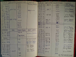 Ja, dat is me wat. Na Nanda (personal trainer in 2009) heb ik Pedro, hele aardige jongen, behalve personal trainer ook fysiotherapeut, wat heel handig is met knieën waar ik op ben gevallen, een rug waar ik doorheen ben gegaan en de nodige spierpijn na nieuwe sporten, zoals een les Body Combat. Elke vrijdag beul ik me af in drie kwartier, vind het nog lekker ook en ga nog een extra keer in de week rare dingen doen zoals intervaltraining op de loopband (halve minuut joggen, minuut rennen en dat zes minuten lang). Daarna doe ik ook nog wel andere dingen. Twintig minuten lopen, fietsen, zwemmen. Maar zwemmen doe ik puur voor de ontspanning, daar ben ik zo aan gewend dat het echt geen effect meer heeft.